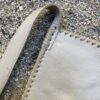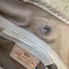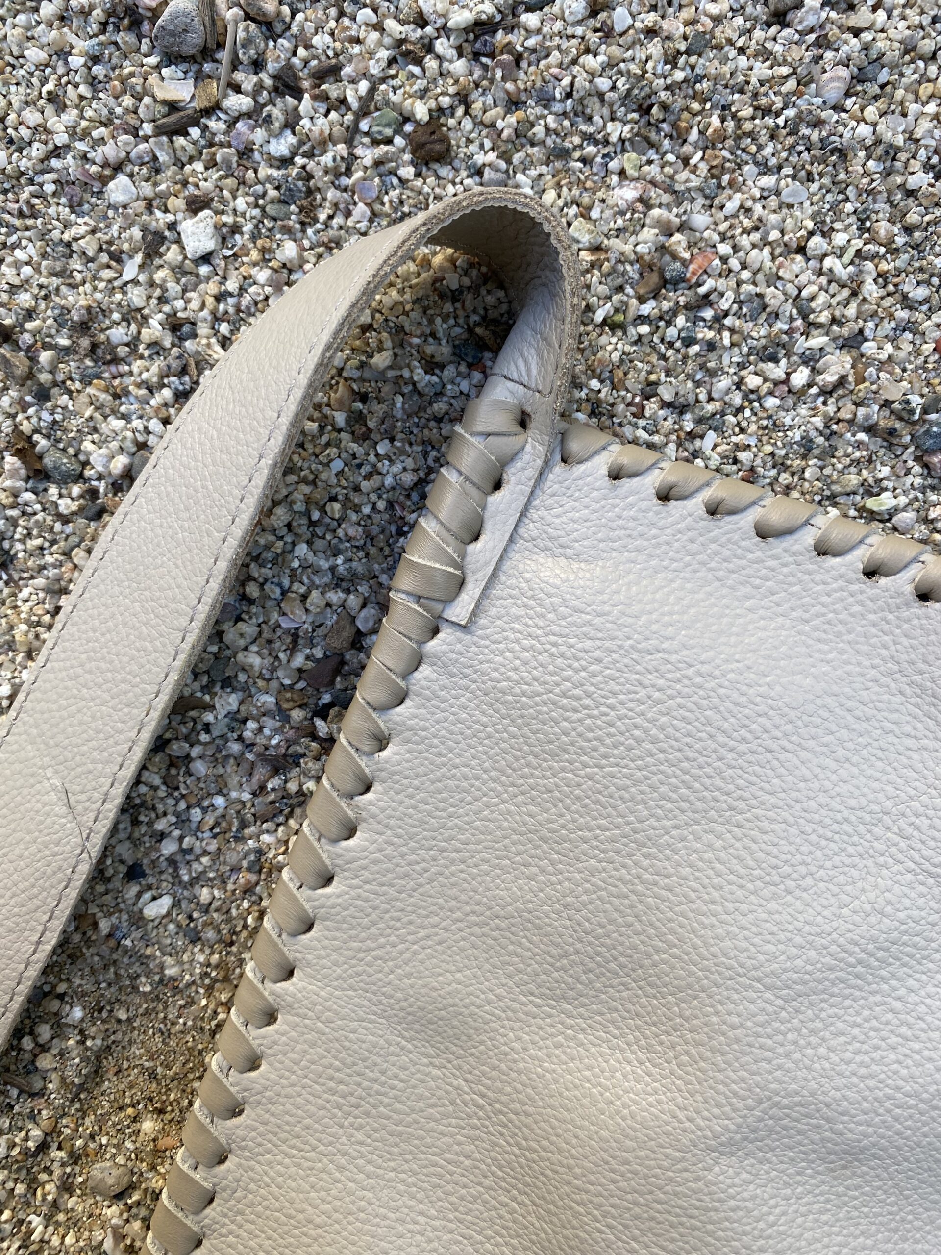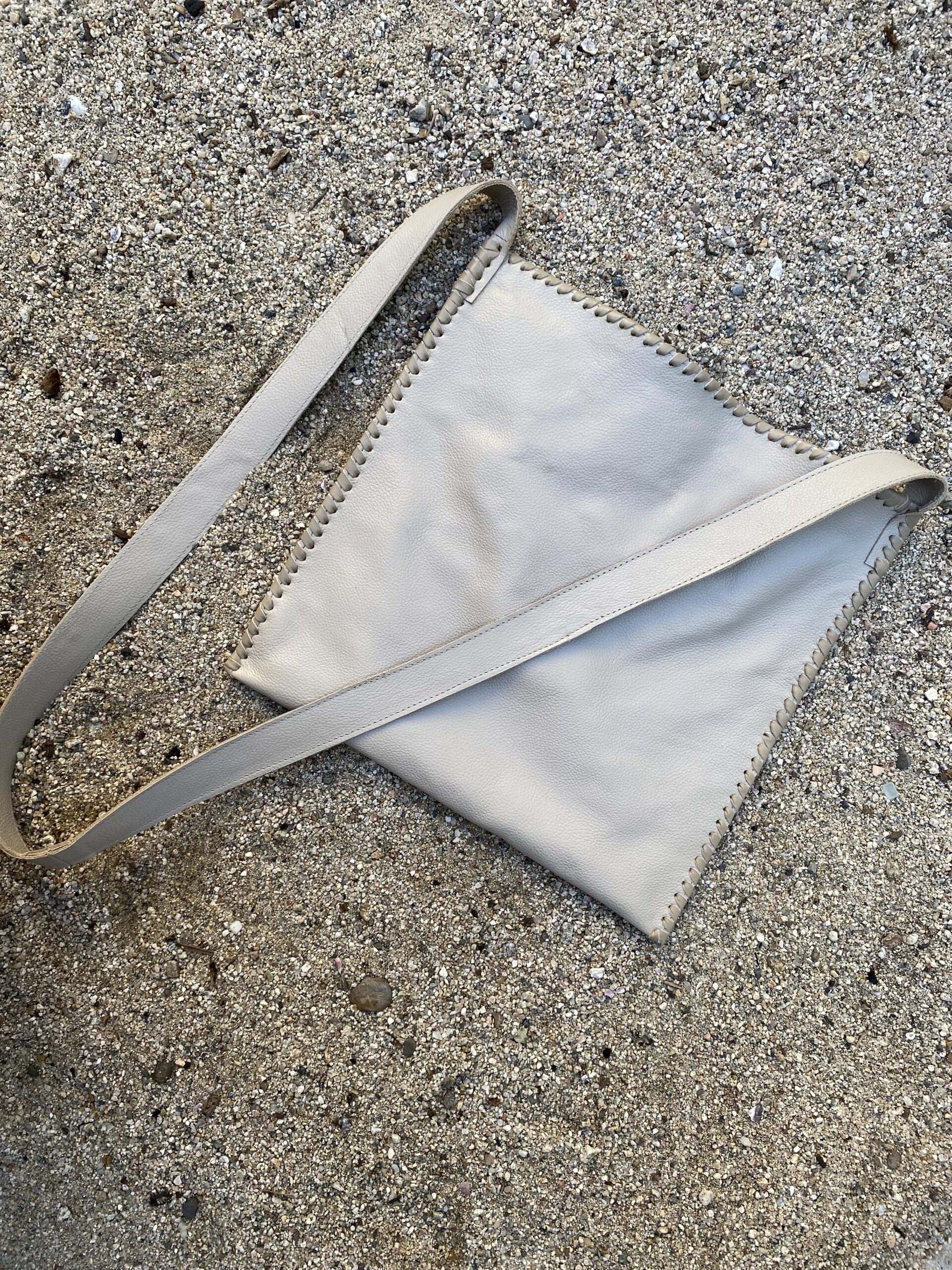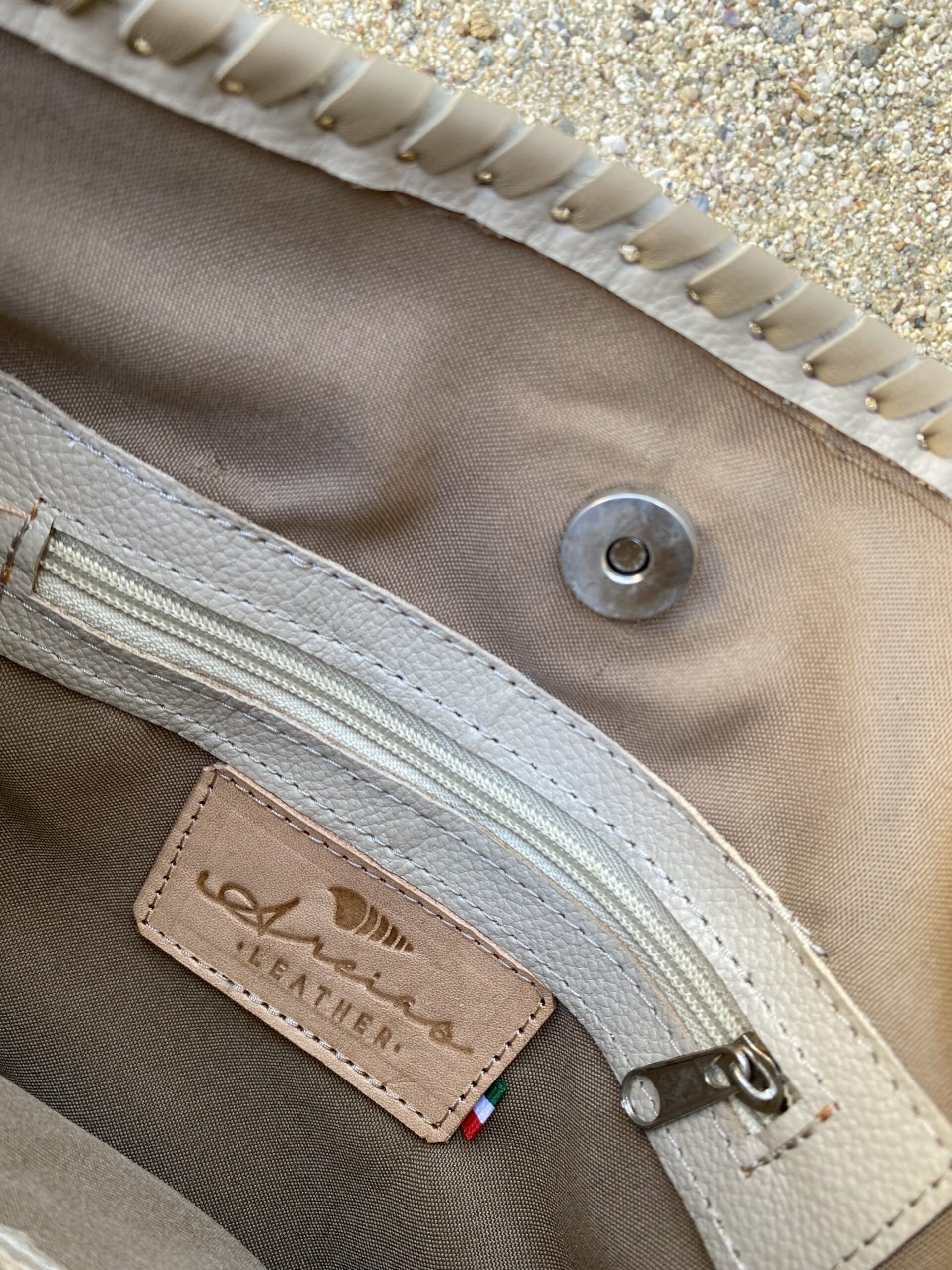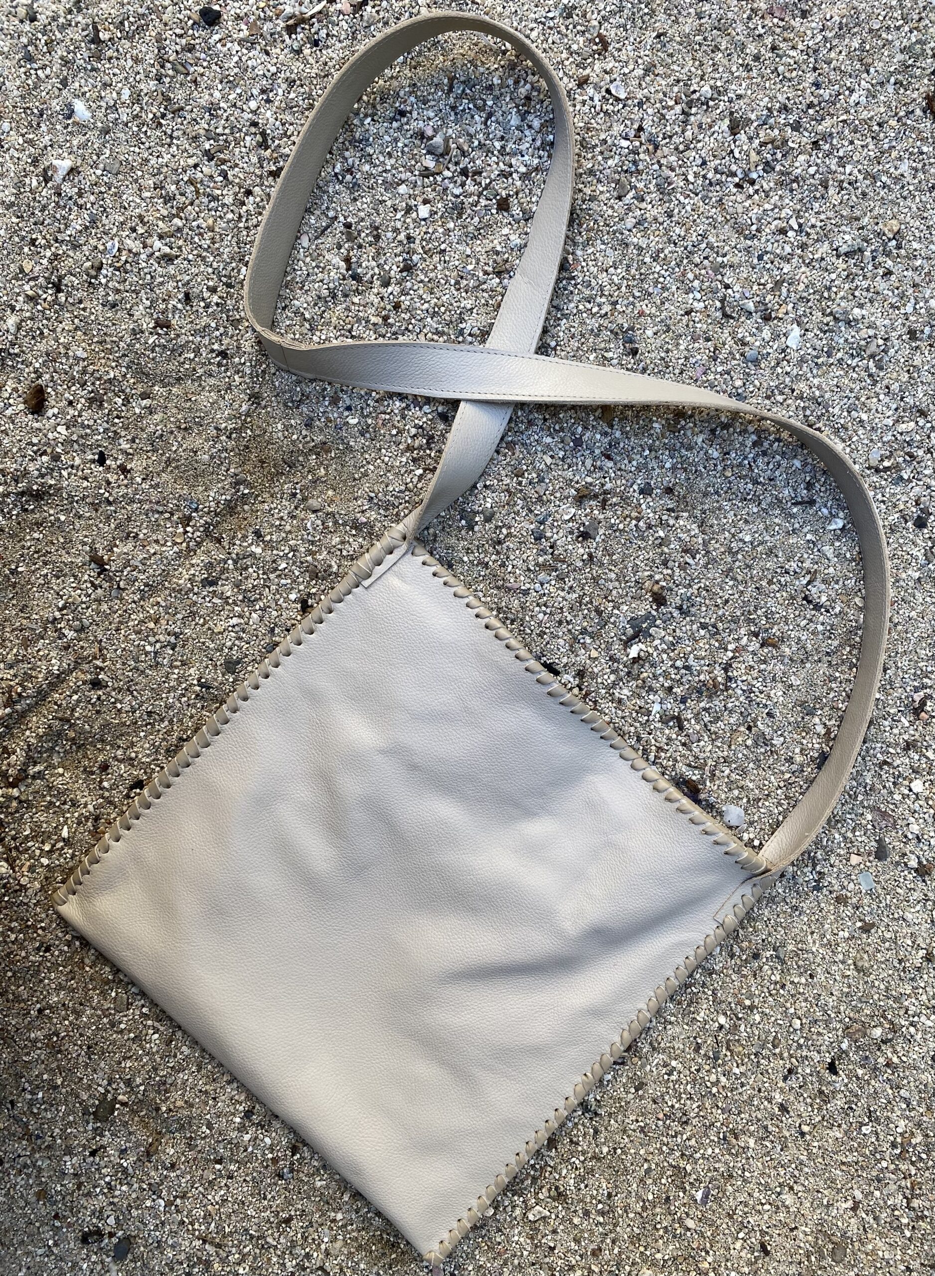 Bone color leather square crossbody bag with wide and flat handle. Laced detailing around the boarders and magnetic closure. The interior is lined and has two inner pocket with zipper closure. this is a medium bag