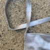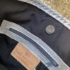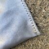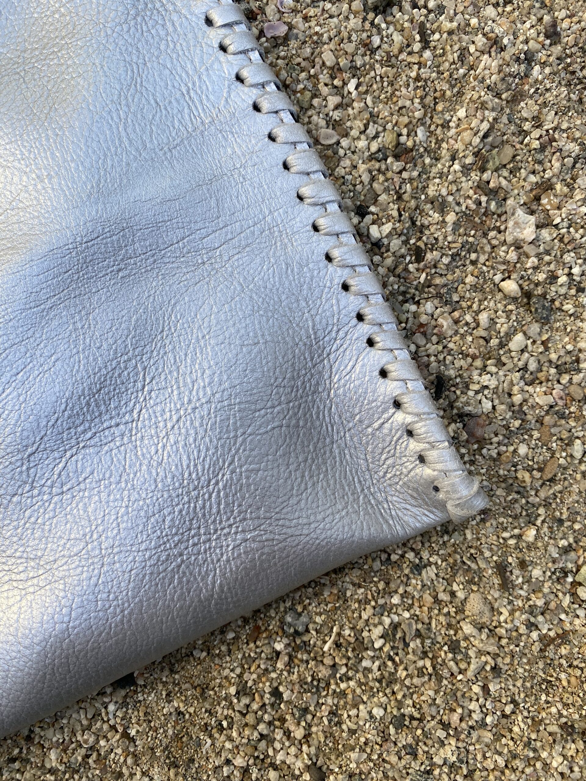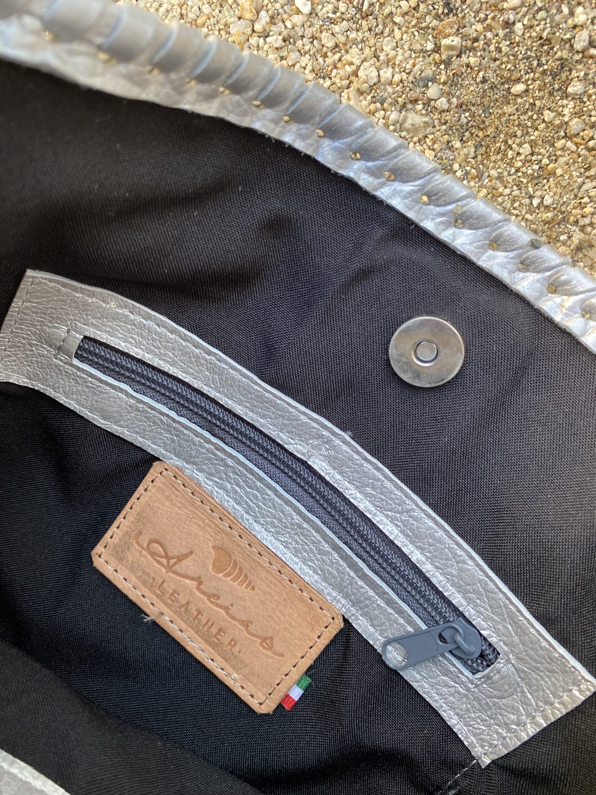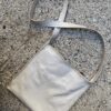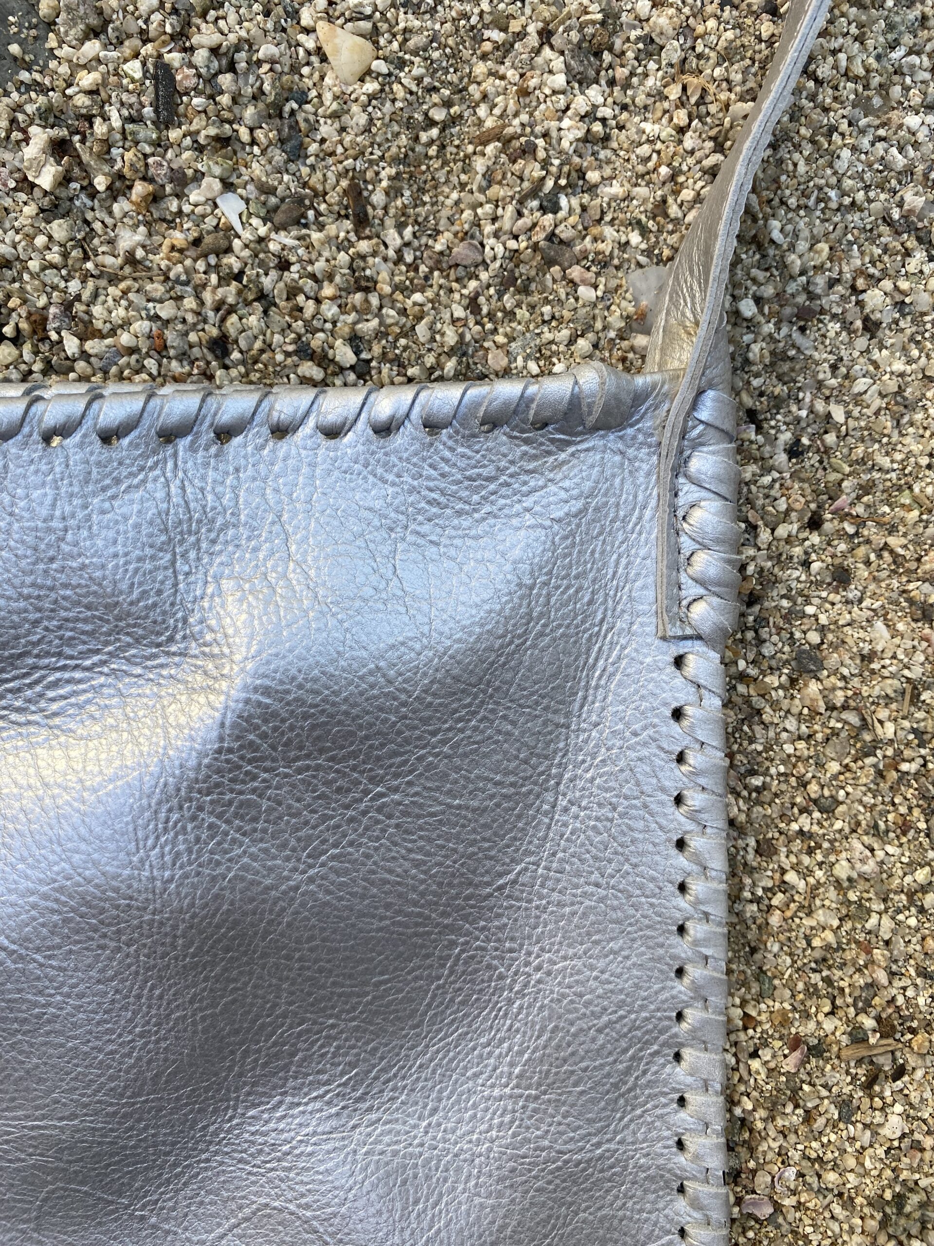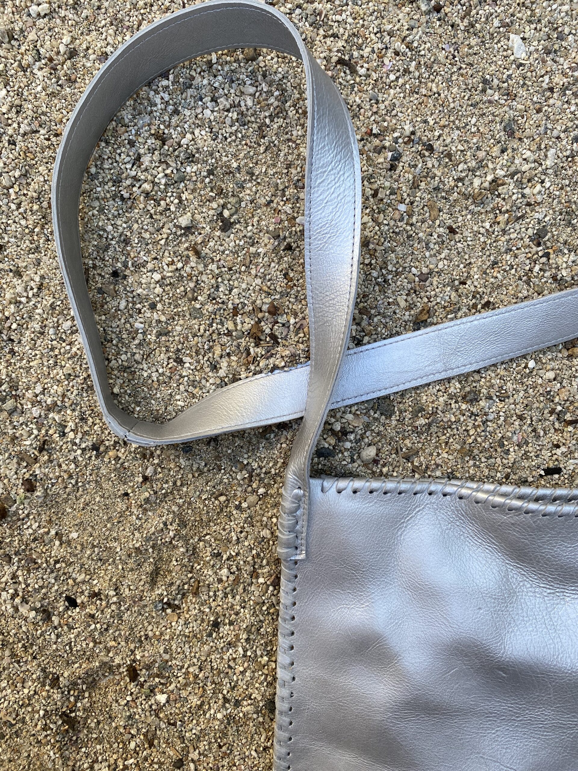 Silver color leather square crossbody bag with wide and flat handle. Laced detailing around the boarders and magnetic closure. The interior is lined and has two inner pocket with zipper closure. this is a medium bag