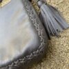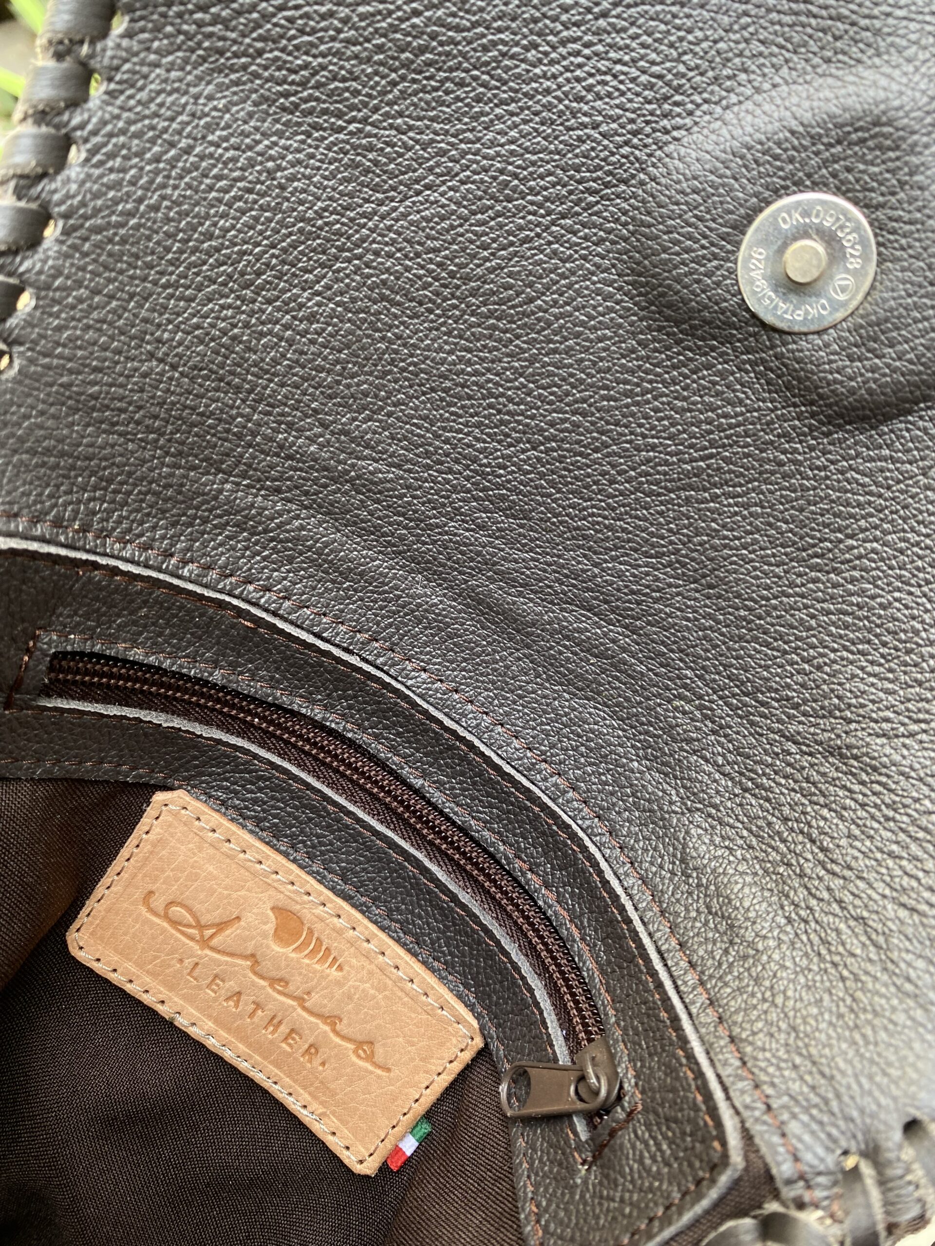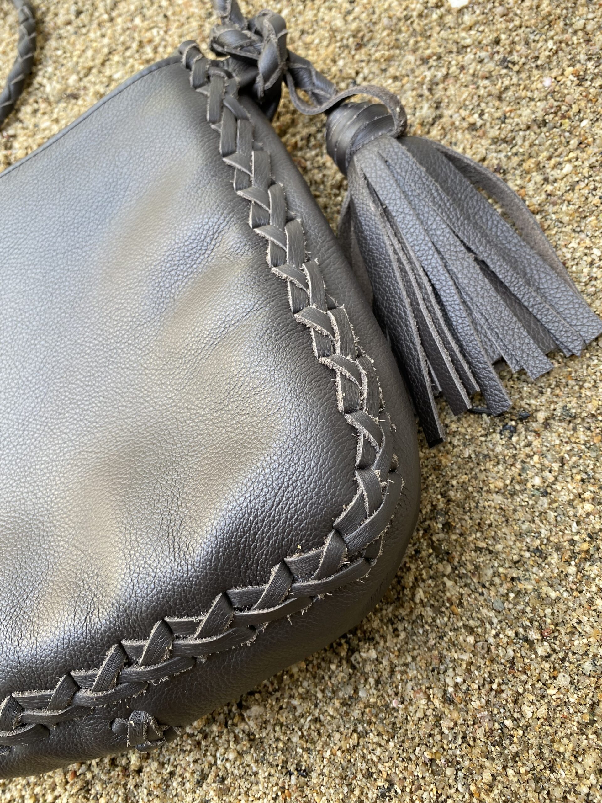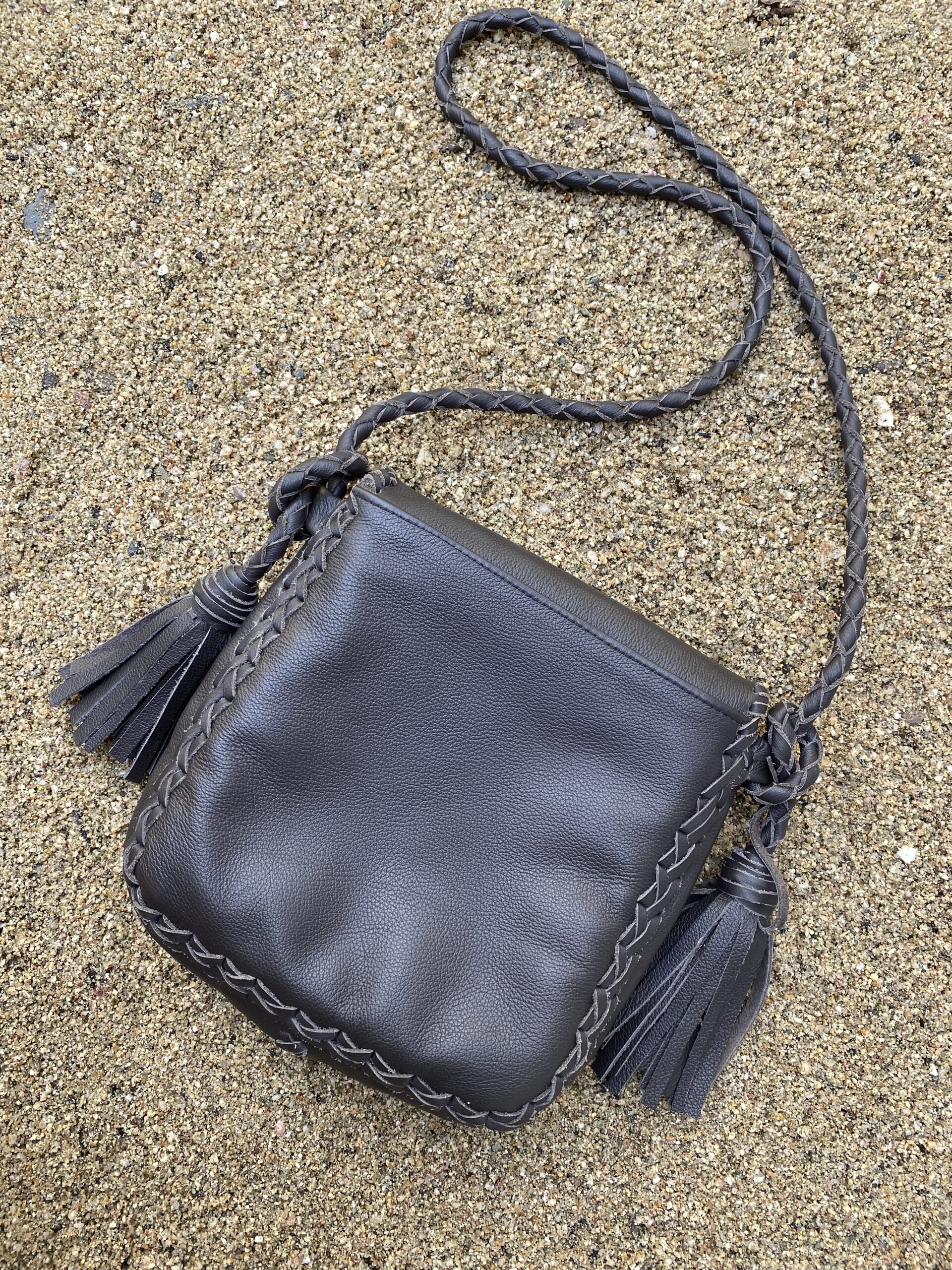 Crossbody Leather bag brown with adjustable straps and a pom-pom detail. It has a magnetic flap closure. The interior is lined and has a zippered pocket.