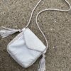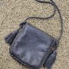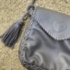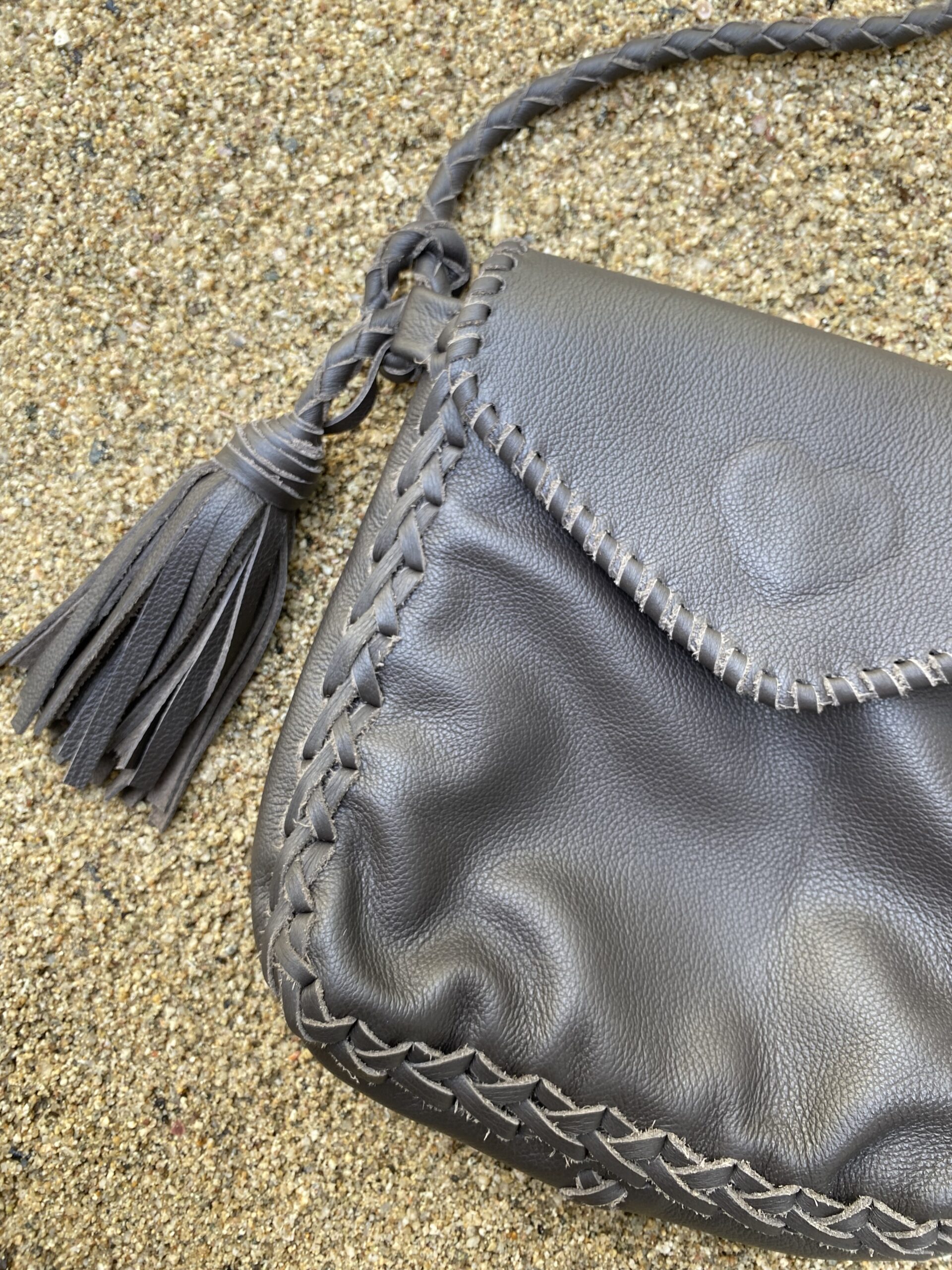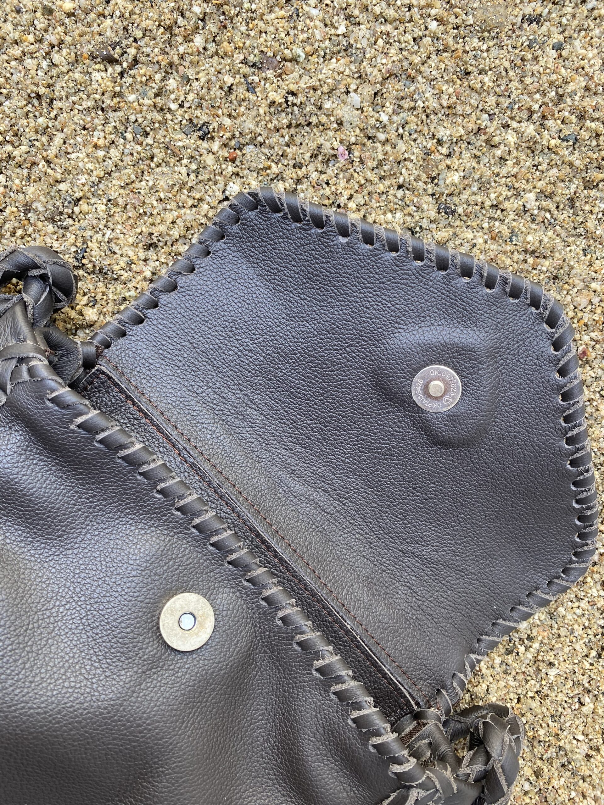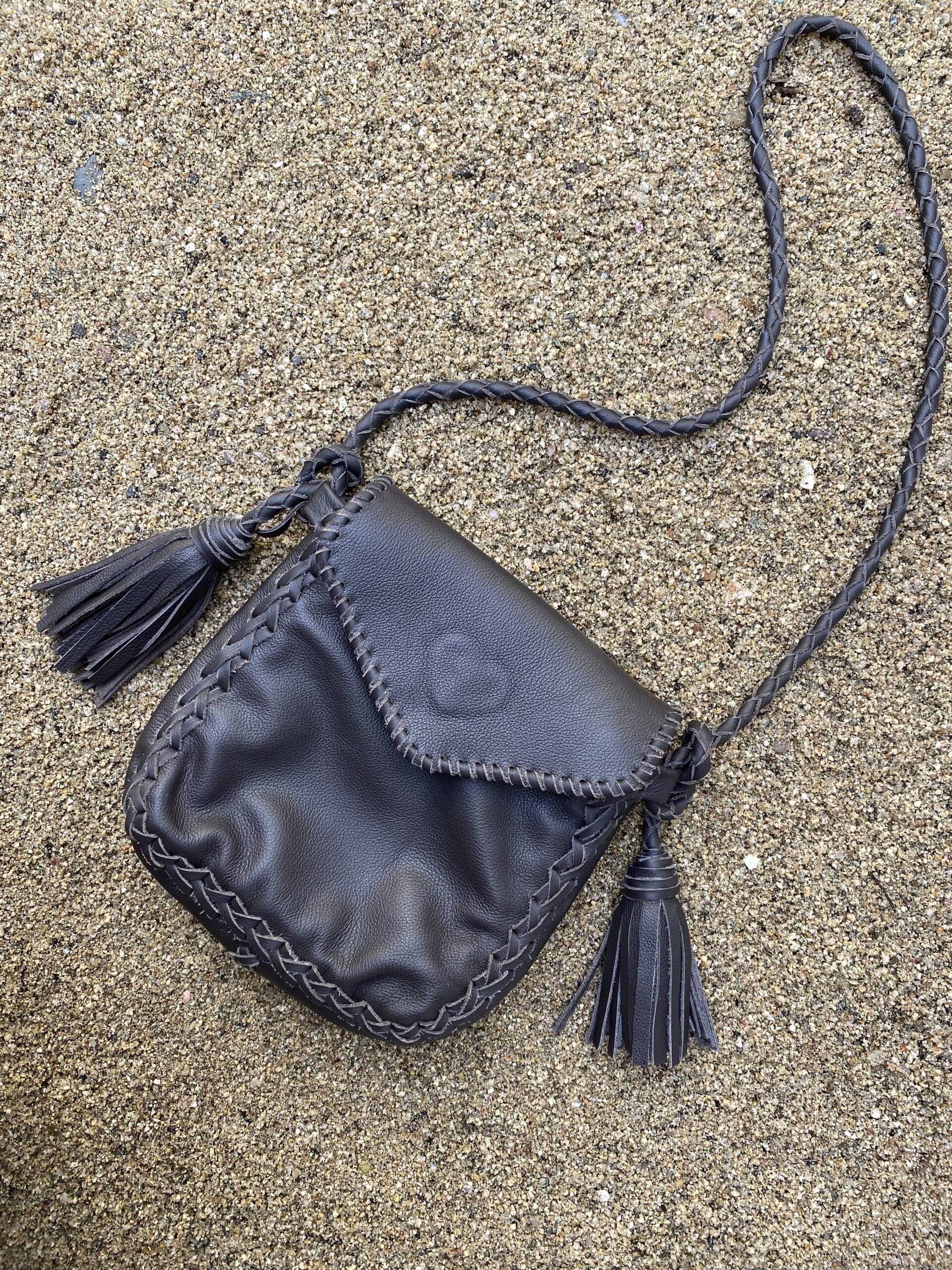 Crossbody Leather bag brown with adjustable straps and a pom-pom detail. It has a magnetic flap closure. The interior is lined and has a zippered pocket.